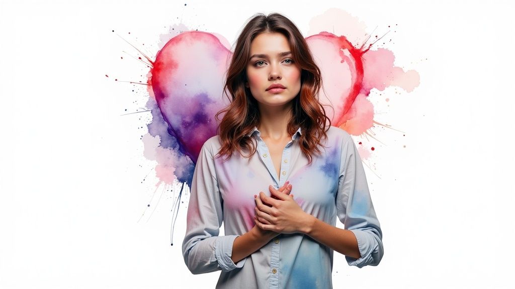 When anxiety strikes, your breathing becomes shallow and rapid, which tightens your chest muscles and only makes the pain worse. Diaphragmatic breathing, or "belly breathing," is the physical antidote to this reaction. You can learn more about its benefits in our guide to breathing exercises for anxiety.
